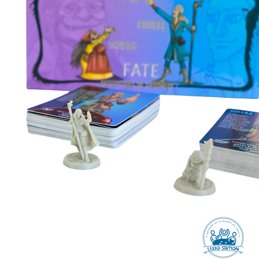 A caixa contém duas miniaturas dos personagens e 40 cartas para cada um deles, sendo 80 cartas ao todo.